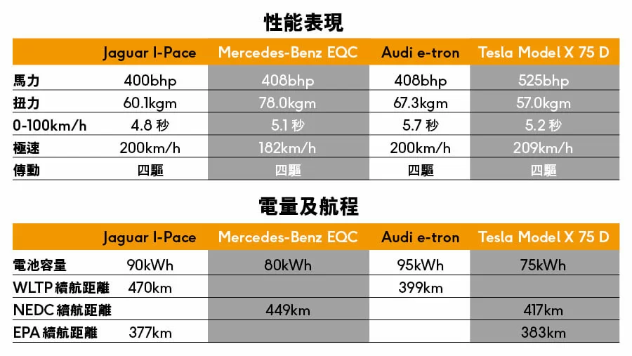 Jaguar I-Pace、Mercedes-Benz EQC、Tesla Model X、Audi e-tron,這四部SUV電動車鬥快、鬥靚、鬥續航距離,到底誰是終極大贏家?