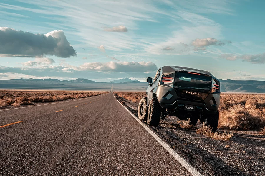 Rowan和我屬於這兩類人之間的中間派,此行目的是在彭美拉這些當地人的幫忙下入鄉隨俗,運氣好的話甚或可以見識到他種生命形態。不過考慮到他們未必懷着善意而來,我們安排了一部相當特別的汽車充當保鑣。Rezvani Tank是用Jeep Wrangler車架改造而成的豪華四驅車,設計風格類似Hip-hop影片中的道具。它的設計者希望填補Hummer留下的市場空隙,造型講究粗壯豪邁,比充斥市面的Escalade、Range Rover和Bentayga都要粗豪。依我所見,這個任務可謂功德圓滿。完成品的車身比例感強而有力,無論遇上camo或真正的天外來客,都應該可以發揮形名相符的保護力。