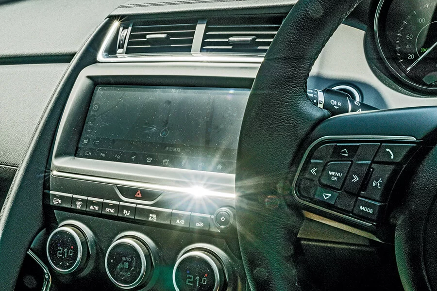 無論如何,開這部車記得常備黑超,金屬面的波棍座、屏幕附近的金屬飾邊,有時會把陽光反射並撲向司機的眼睛,不知是否英國陽光少令設計師一時忽略了。另一個反光位是顯示屏,那怕調到最光猛,但嚴重斜向天的擺放角度表示屏幕易患上白內障,迷朦一片,好就好在是啞面而非玻璃面,想打個指膜留為紀念並不容易。在沒有陽光的日子,即會見到無論中央顯示屏還是軚盤前的儀錶,以2019年的標準來講難說高清,Mercedes-Benz、BMW、Audi等最新的系統遠比它精緻細膩。不過講到實用性就非常高,司機前面的儀錶布局活像一隻烏龜,細心看看原來一切要知的資訊已經包羅其中。油耗、餘下航距、平均車速,有些車款要換頁才能看到,但E-Pace同一個畫面即能顯示,卻又不會令人眼花花。