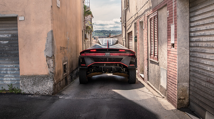 把RS Q送上那個用Q7拖曳的拖卡時,我自問從未見過這麼險的泊車方法。我們的卸貨地點,是一個位於城鎮邊緣的電動車充電站。我本來想直接開這部賽車過去,但向撒丁當局申請許可証……原來不是那麼直截了當的事。不過我們已經和鎮長打過招呼,鎮長大人亦打算趁此機會露一露面。